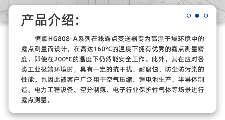 恒歌HG808-A系列在線露點變送器專為高溫干燥環境中的露點測量而設計,在高達160°C的溫度下擁有優秀的露點測量精度,即使在190°℃的溫度下仍然能安全工作。此外,其在應對各類工業極端環境時,具有一定的抗干擾、耐腐蝕、防塵防污染的性能。也因此被客戶廣泛用于空氣壓縮、鋰電池生產、半導體制造、電力工程設備、空分制氮、電子行業保護性氣體等場景進行露點測量。